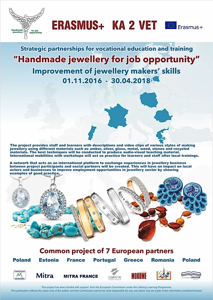 Η σχολή μας συμμετείχε από τον Νοέμβριο του 2016 έως τον Απρίλιο του 2018 στο δεκαοχτάμηνο Ευρωπαϊκό Πρόγραμμα Erasmus+ "Handmade jewellery for job opportunity".